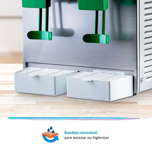 Ofereça uma dupla opção com a Refresqueira BBS 2.Com 2 depósitos de 15 litros cada, armazena duas opções de bebidas na temperatura ideal para o consumo. Este modelo IBBL possui torneiras totalmente desmontáveis para higienização, garante boa conservação dos líquidos com o controle automático de temperatura e baixo consumo de energia com o sistema de refrigeração balanceada.